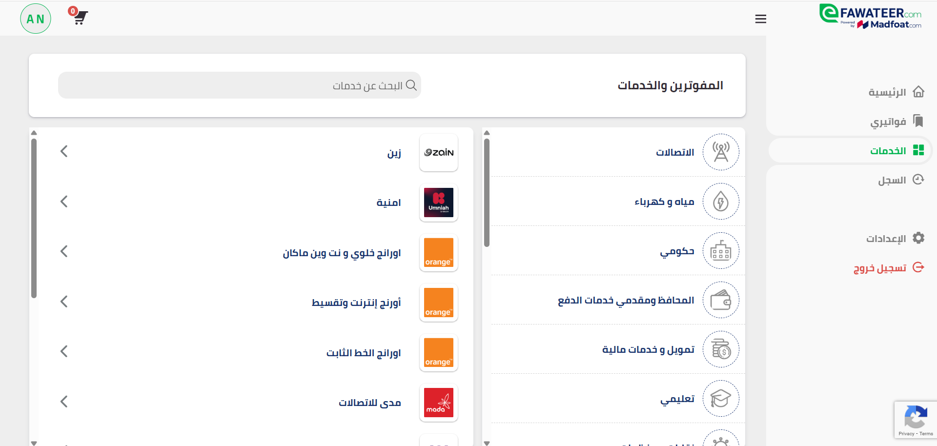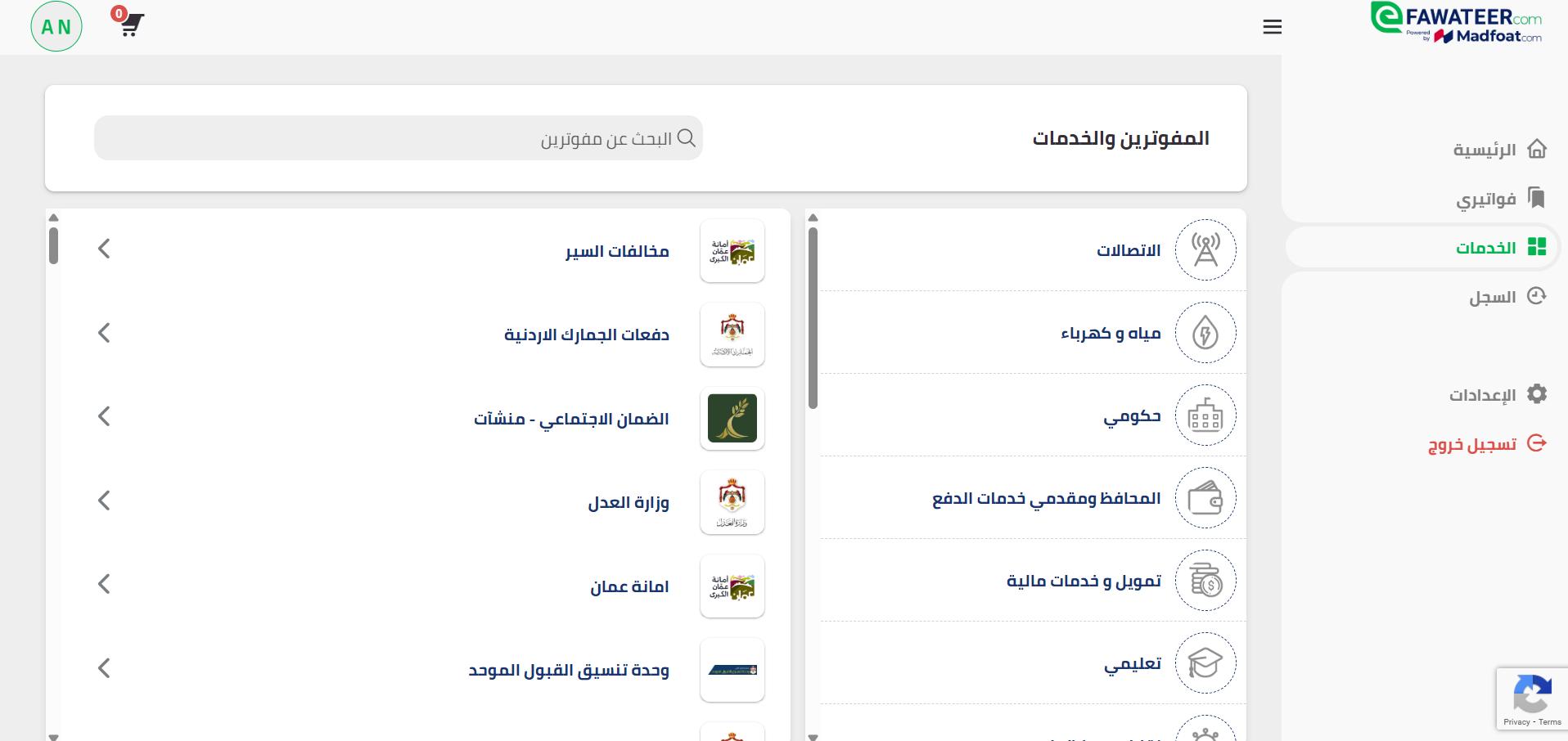 من الصفحة الرئيسية، اختر تبويب الخدمات في القائمة الجانبية على اليمين، وبذلك ستنتقل إلى الخدمات التي تشمل المفوترين أو مزودي الخدمة في مختلف القطاعات، مثل التعليم والاتصالات والمياه والكهرباء وغيرها. ولإتمام دفع مخالفة السير، اضغط على خيار حكومي.