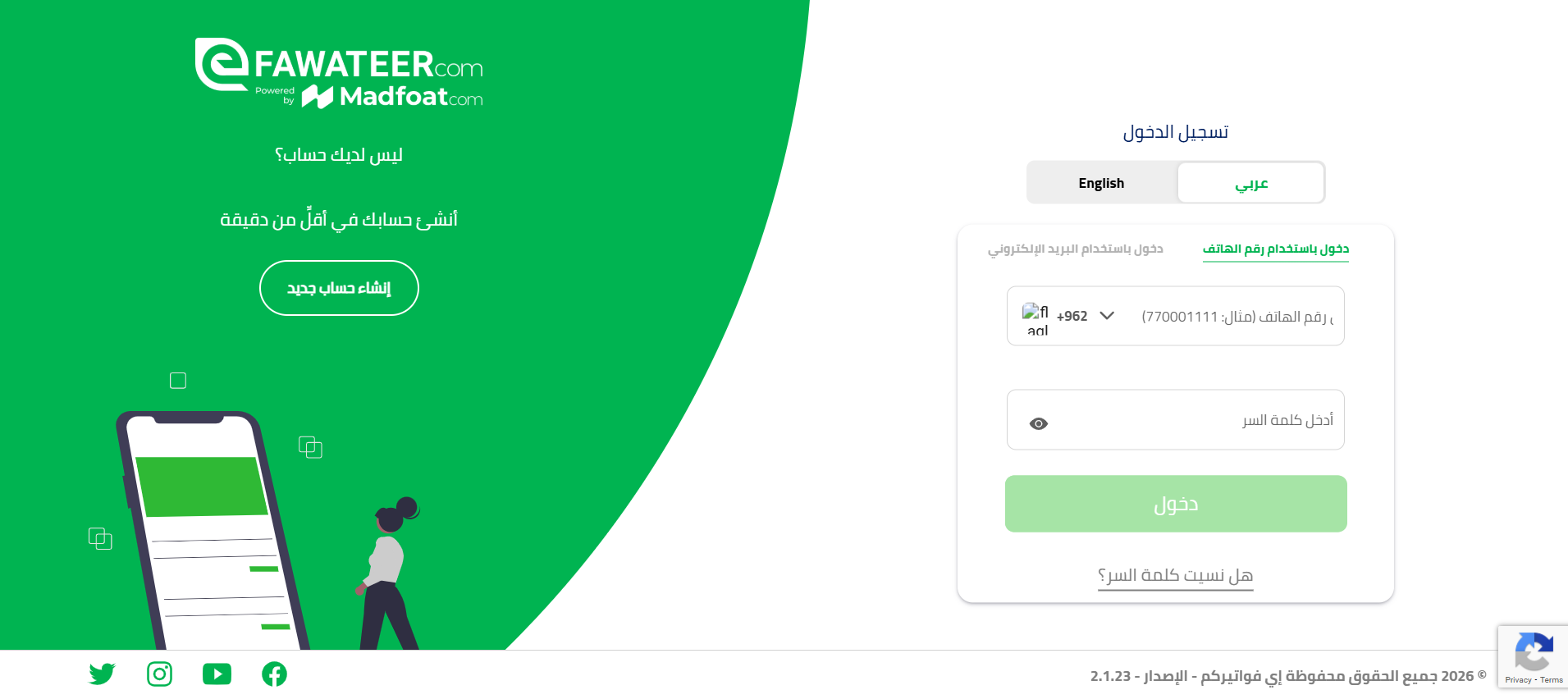 لإتمام عملية دفع مخالفات السير عن طريق إي فواتيركم، قم بتسجيل الدخول إلى حسابك باستخدام رقم هاتفك أو بريدك الإلكتروني. وفي حال نسيت كلمة المرور، يمكنك الضغط على خيار نسيت كلمة المرور لاستعادتها ومتابعة تسجيل الدخول.