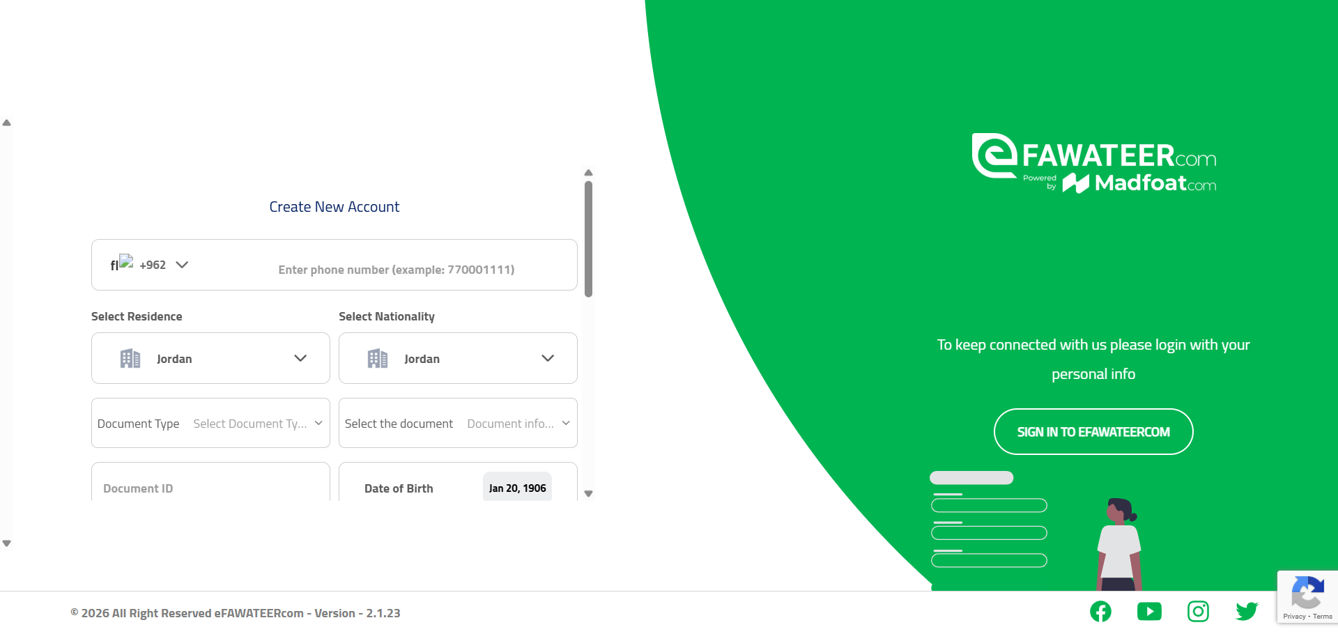 If this is your first time paying with eFAWATEERcom, you should access the portal and create an account by filling in some fields with the required information, including your name, phone number, email address, password, and other details.
